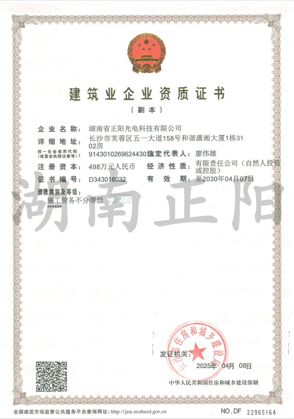 2025年4月8日,經長沙市住房和城鄉建設局審核批準,湖南省正陽光電科技有限公司成功獲得“施工勞務”資...